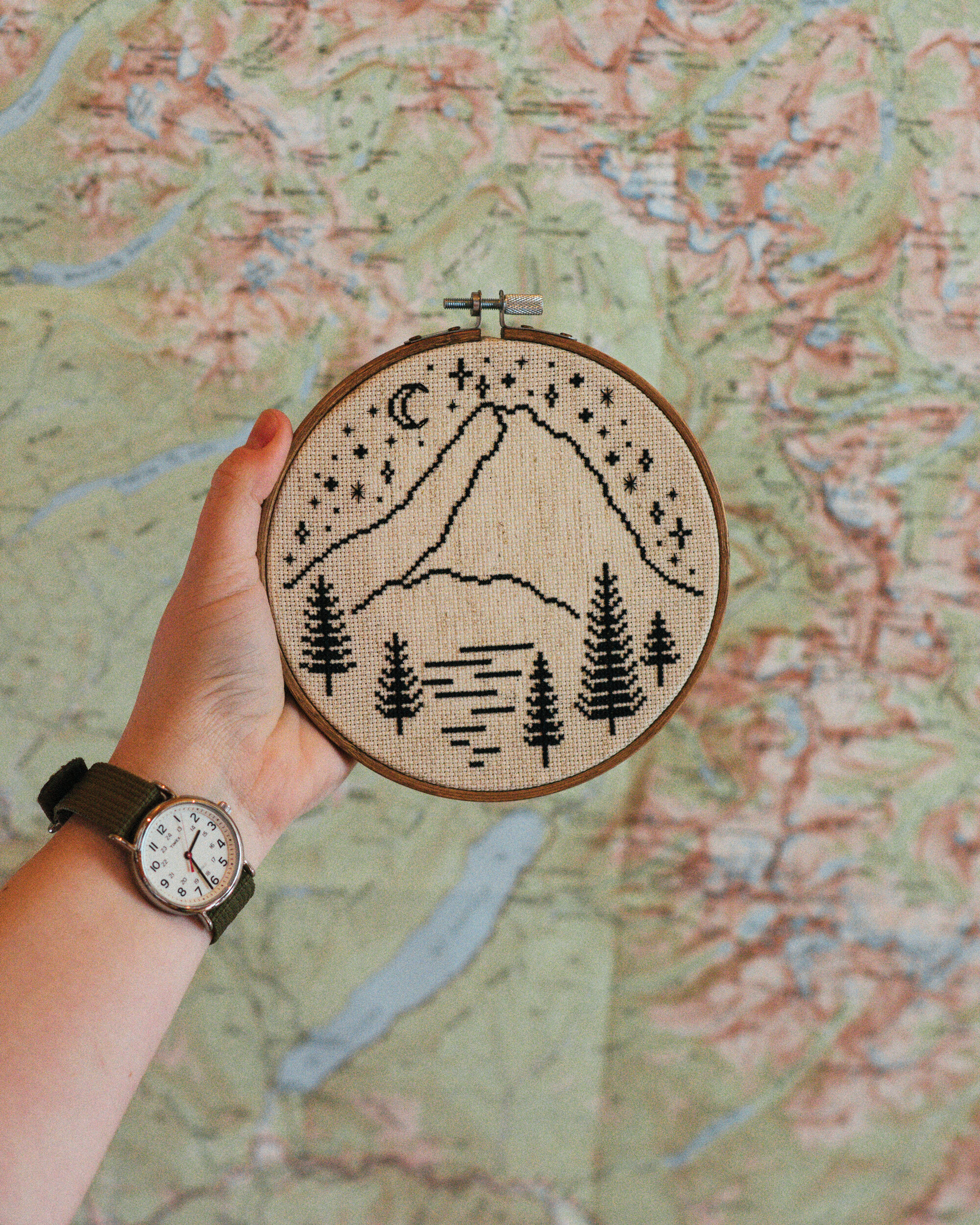⩕ stitched on 18 count cloth. If you use 14 count cloth, you’ll want to use a 7˝ or 8˝ hoop.